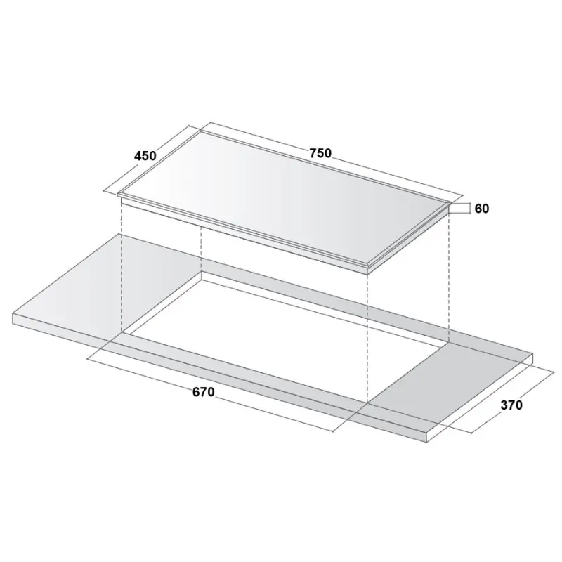 - Kích thước khoét lỗ: 670 x 370 mm
