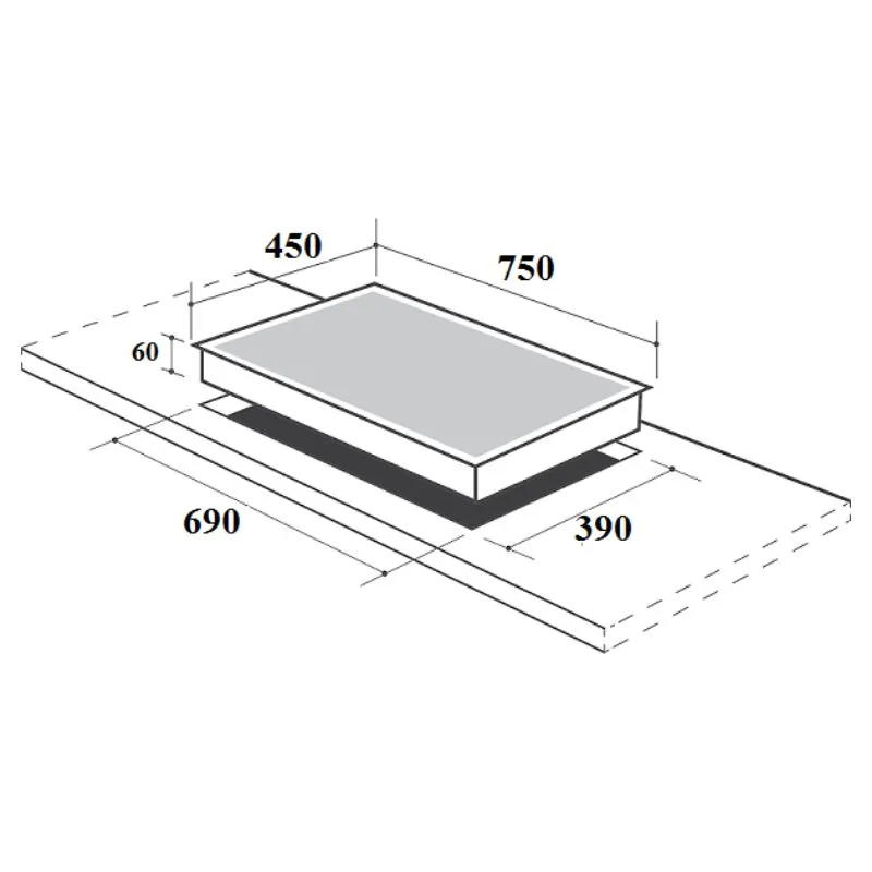 - Kích thước khoét đá: 690x390mm