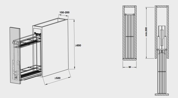 Thông số kỹ thuật của bộ rổ kéo Hafele 549.34.021 cho tủ hẹp 200mm