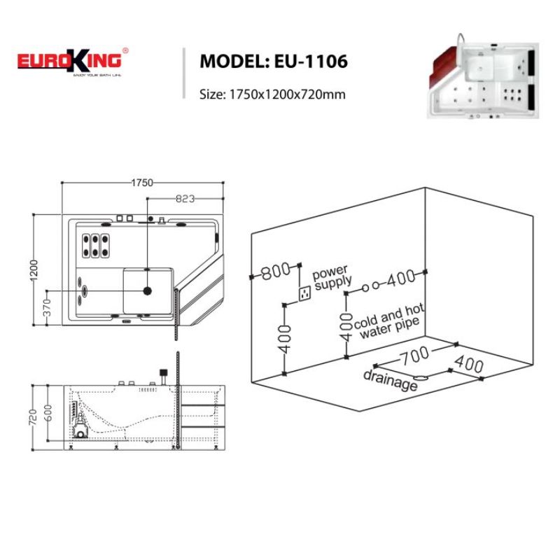- Tuy một bên bị khoét sâu vào thì sẽ làm mất đi khá nhiều diện tích trong lòng bồn. Nhưng chúng tôi vẫn trang bị đầy đủ hai gối cổ cho bạn. Bởi kích thước của EU-1106 là 1750 x 1200 x 720 mm vẫn cho bạn yên tâm khi sử dụng hai người. Chất liệu acrylic quen thuộc sẽ luôn không làm bạn thất vọng. Bởi tính chịu nhiệt tốt, bền bỉ, sáng bóng theo thời gian của nó. Thì không ai có thể phủ nhận được.