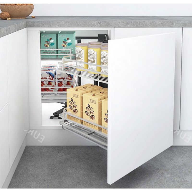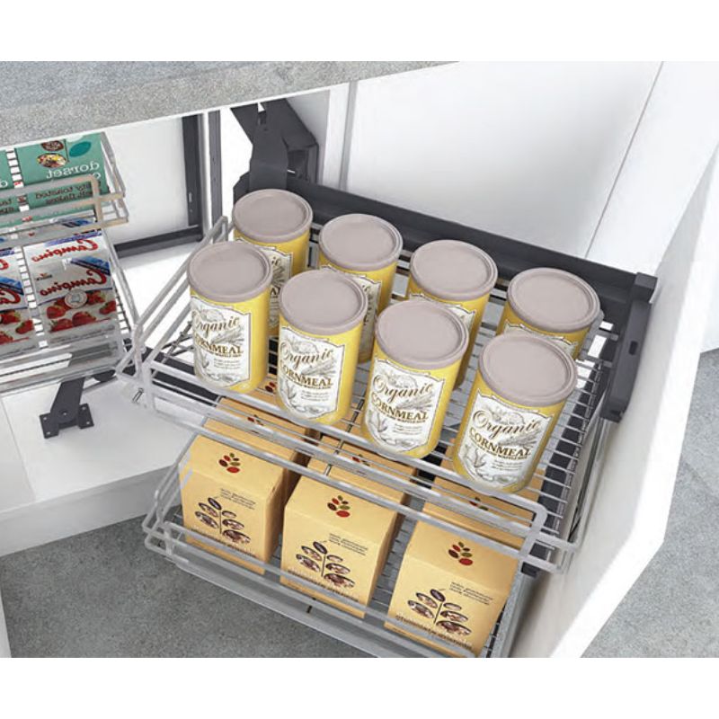 - Có 4 sàn đựng dạng nan nằm trong 1 góc tủ bếp giúp bạn vừa đựng được nhiều đồ vừa tiết kiệm không gian.