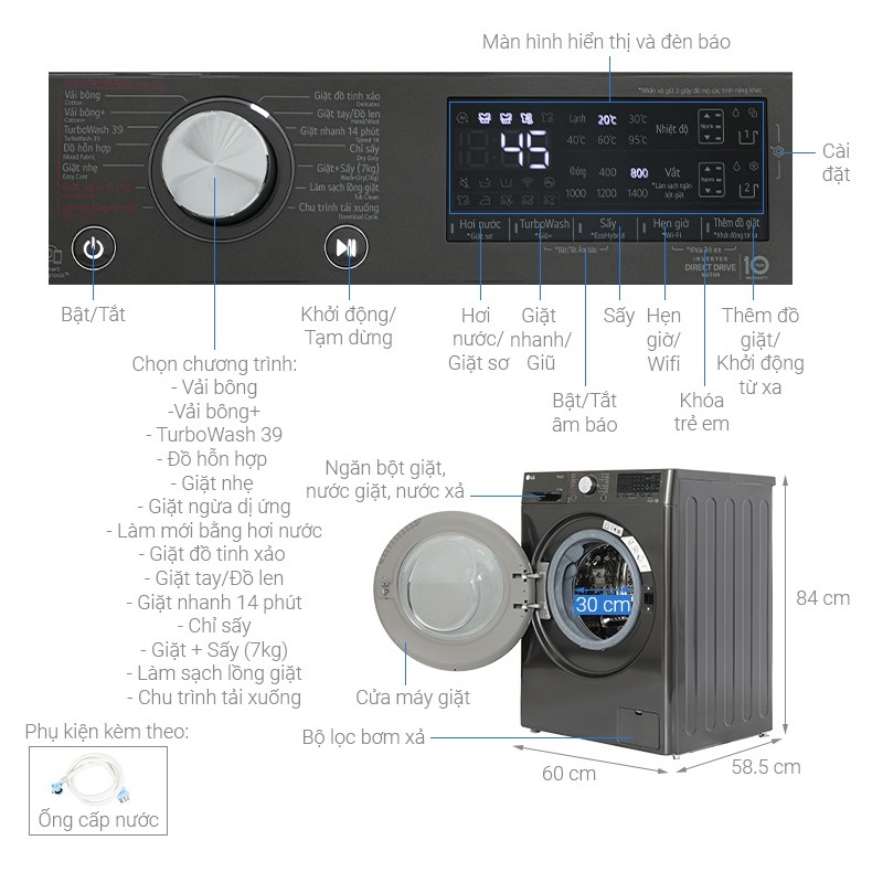 - Sử dụng động cơ truyền động trực tiếp tích hợp Inverter vận hành êm, tiết kiệm điện.