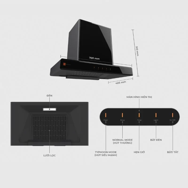- Công suất mạnh mẽ vận hành êm ái: HRH-701 có công suất hút siêu mạnh mẽ với 1,200 m3/h với độ ồn chỉ <57dB. Lực hút mạnh với độ ồn thấp, đảm bảo xử lý hiệu quả mùi thức ăn mà không ảnh hưởng đến sinh hoạt của các thành viên trong gia đình.