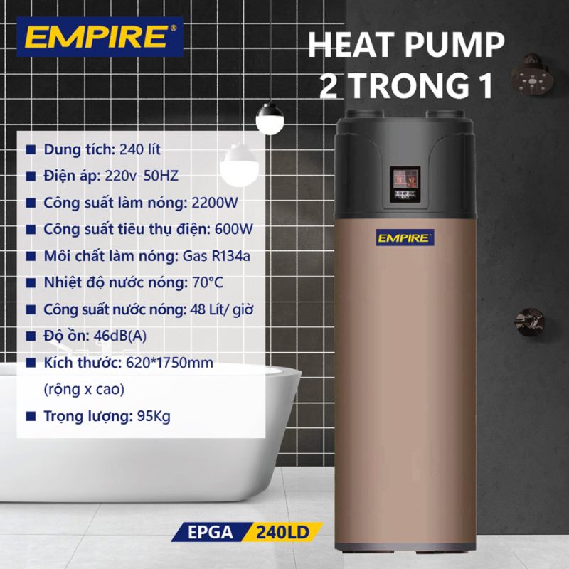 - Thiết kế 2 trong 1 tiện lợi, hiệu suất tối ưu: Máy nước nóng Heat Pump Empire 2 trong 1 EPGA-240LD 240 Lít có kích thước 62 x 175cm (Rộng x Cao), phù hợp lắp đặt ở nhiều không gian. Thiết kế quạt thông gió trục, tăng hiệu quả hoạt động, tối ưu quá trình làm nóng và giúp máy vận hành ổn định. Điểm nổi bật của máy nước nóng Empire EPGA-240LD là thiết kế 2 trong 1, kết hợp giữa máy bơm nhiệt Heat Pump và bình chứa nước nóng trong cùng một sản phẩm. Điều này không chỉ giúp tiết kiệm không gian lắp đặt mà còn tăng cường hiệu suất hoạt động, đảm bảo cung cấp lượng nước nóng liên tục lên đến 48 lít/giờ với nhiệt độ làm nóng tối đa tham khảo là 60°C.
