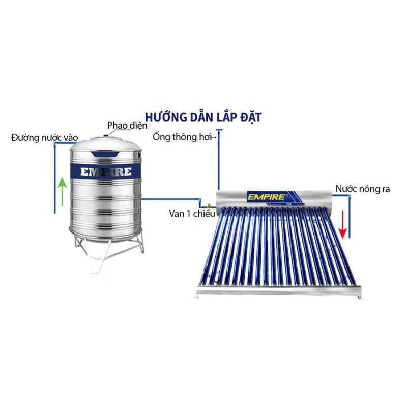 - Hệ thống 20 ống thủy tinh dài 1.8m: Máy nước nóng năng lượng mặt trời Empire được trang bị hệ thống 20 ống thủy tinh được nung ở nhiệt độ cao, có đường kính Fi58, chiều dài 1.8m, tăng cường khả năng hấp thụ ánh sáng và chuyển hóa thành nhiệt để làm nóng nước. Khi lắp đặt, phần ống thủy tinh nên quay về hướng Tây Nam để đảm bảo tối đa thời gian tiếp xúc với ánh nắng mặt trời, giúp hấp thụ nhiệt hiệu quả nhất.