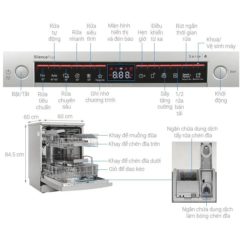 - Rửa nhanh 65°C (Express): 62˚C Rửa tiết kiệm nước và năng lượng