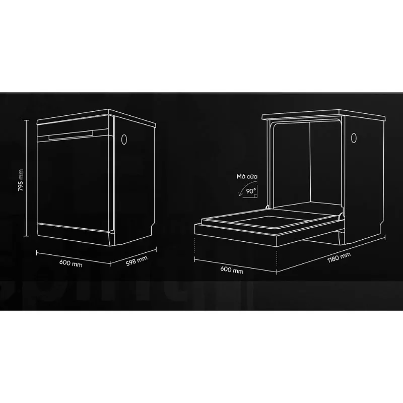 - Chiều sâu máy khi mở cửa: 1130 mm