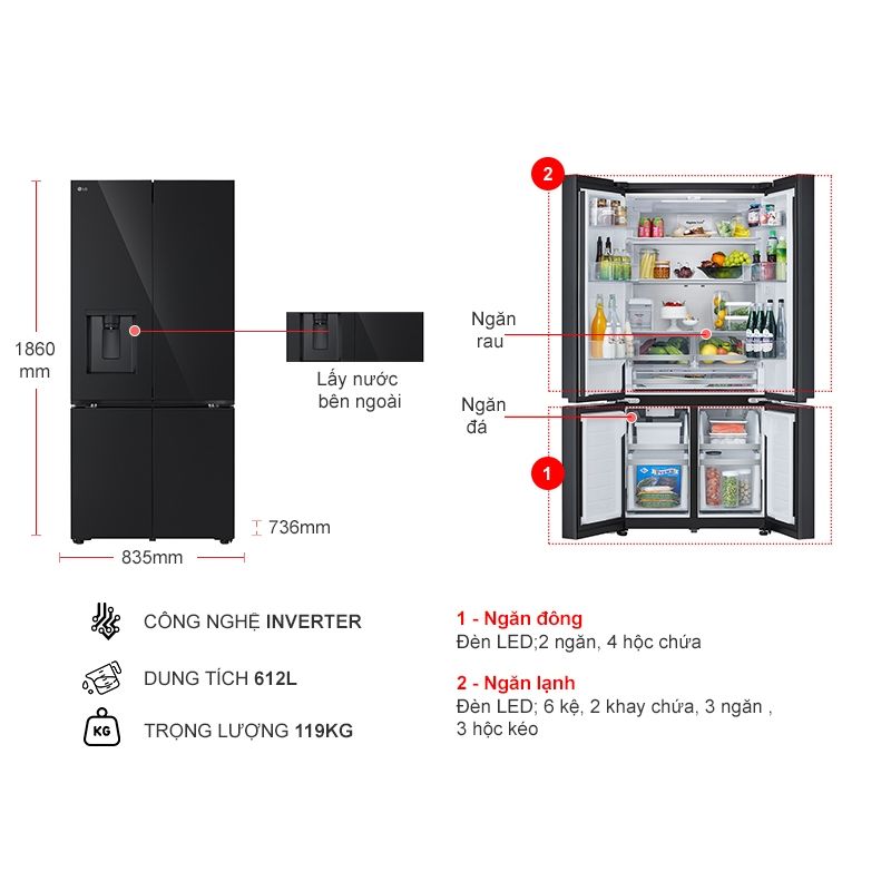 - Dung tích 612L, phù hợp với gia đình có trên 5 thành viên.